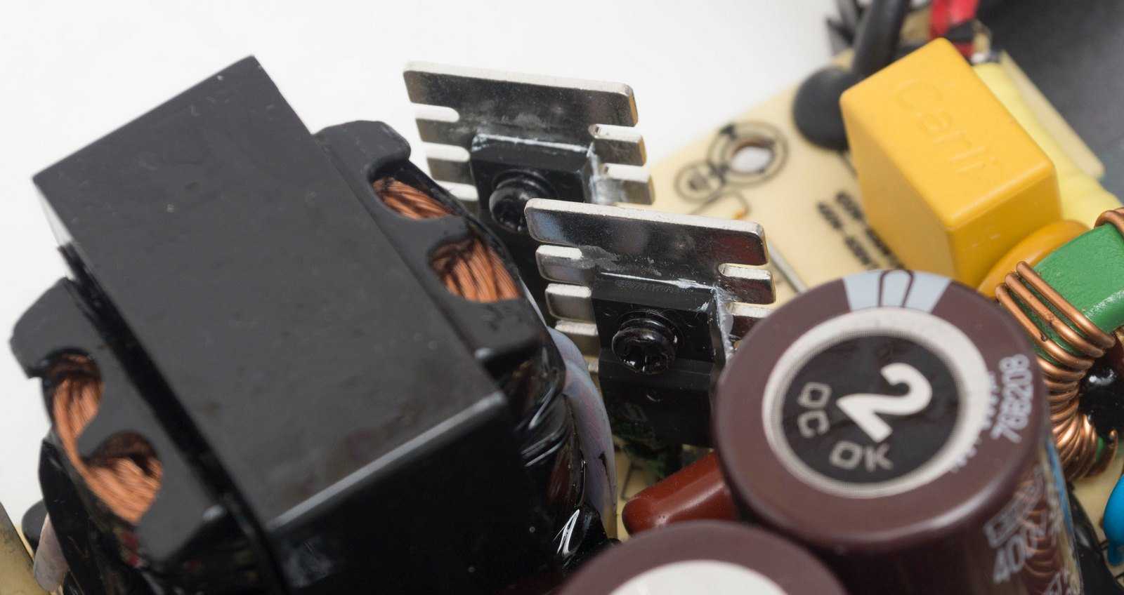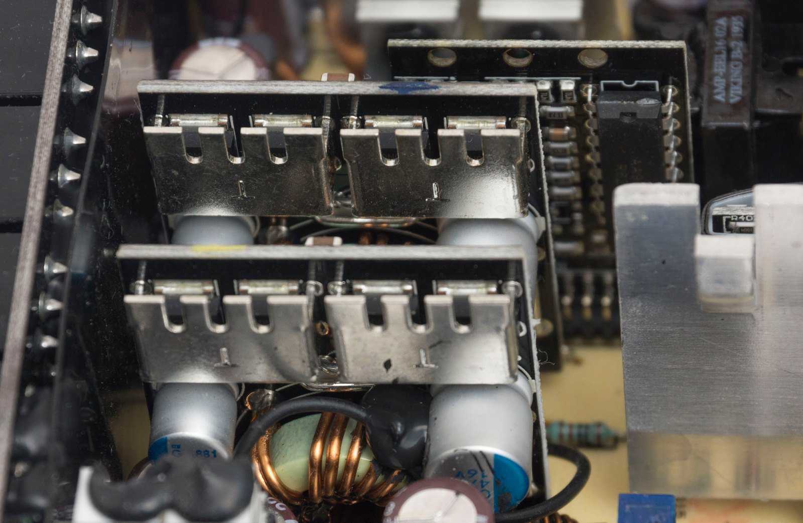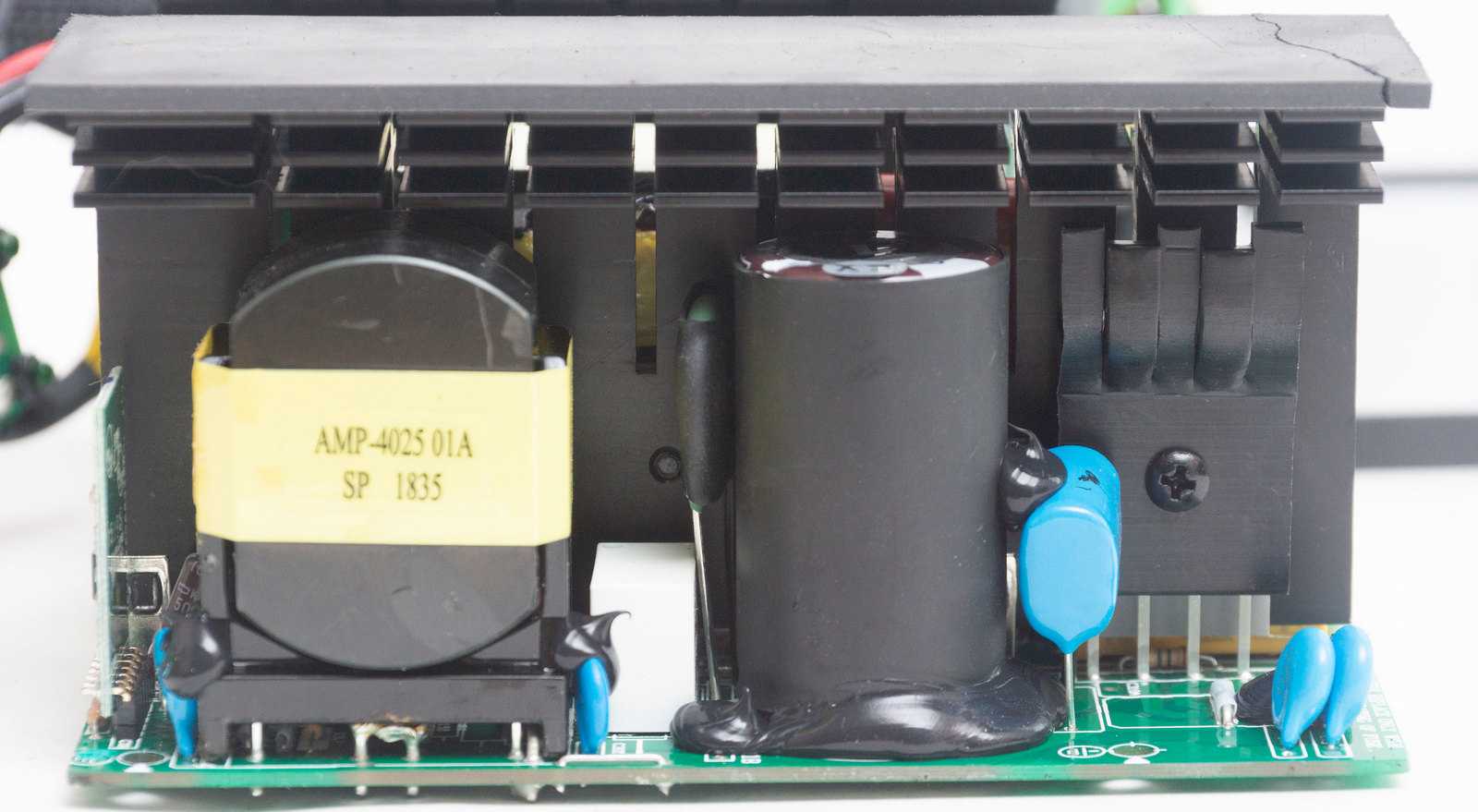 Фильтрация помех на выходах осуществляется за счет электролитических конденсаторов японского производства Chemi-Con, рассчитанных на температуру до 105 °C, и полимерных Teapo.