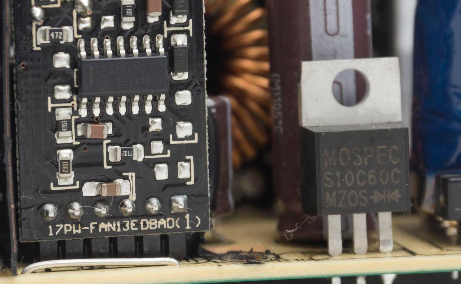 В корректоре используется один транзистор IPW5R140P и повышающий диод. Управляет корректором микросхема NCP1653A на собственной вертикальной плате.