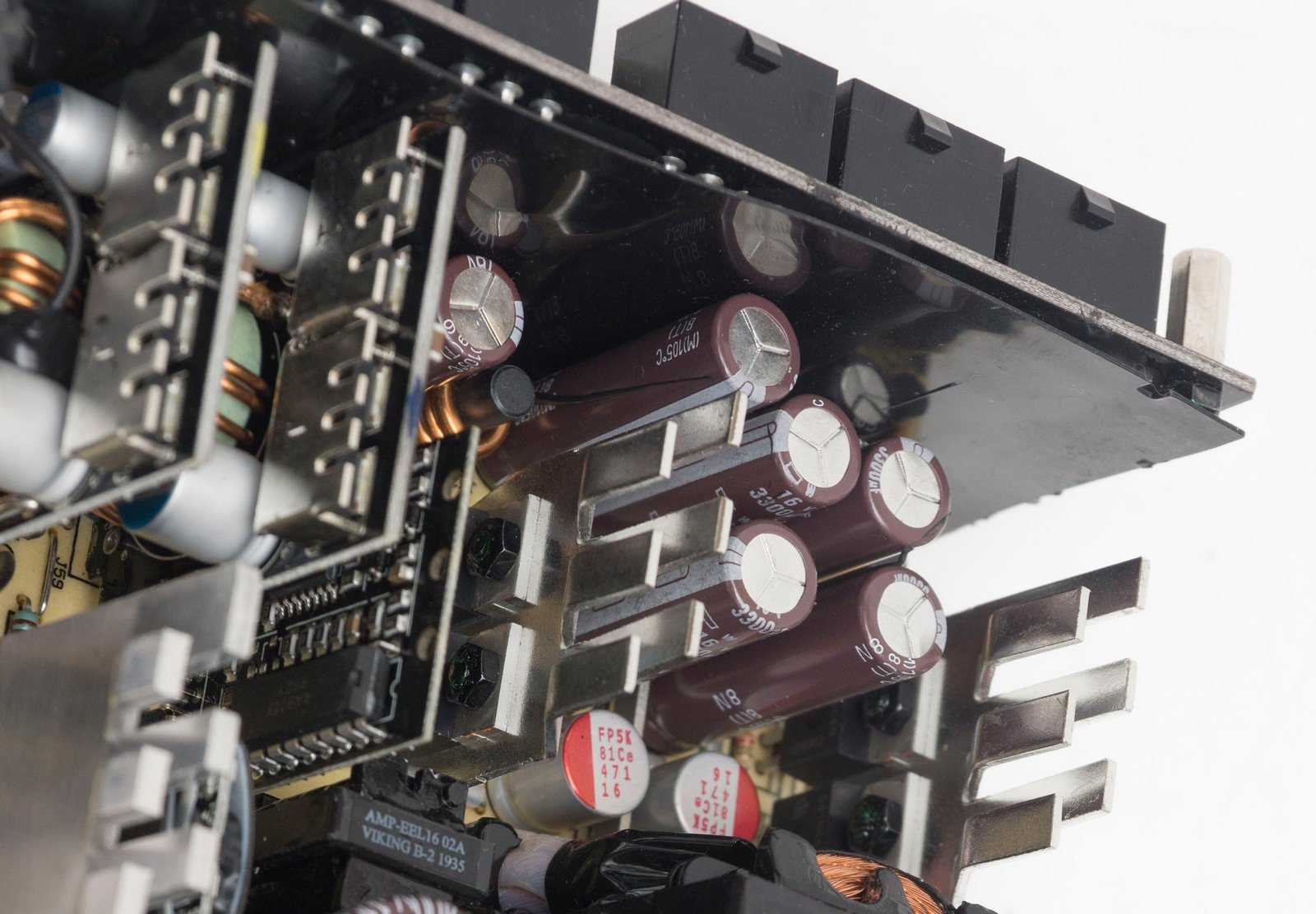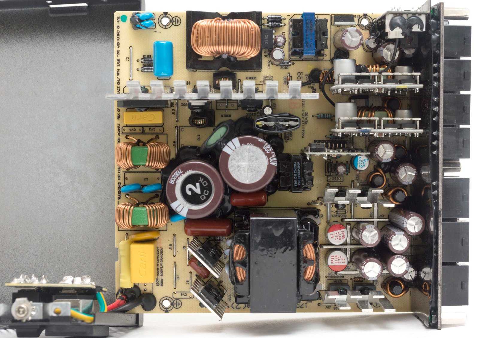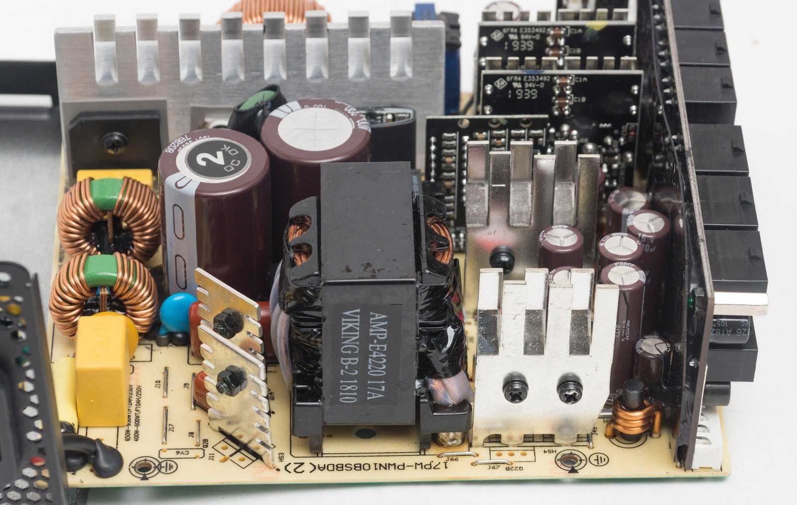 Но с другой стороны, как пользователю, нам бы хотелось видеть более современное исполнение. Полностью модульные блоки питания, даже меньшей длины, уже далеко не редкость. Использование проводов для подключения платы с разъемами также уже редко встретишь. Отсутствие элементарного варистора в схеме защиты нам не понятно. Напряжения хоть и вписываются в стандарт, но отклонение в 4% по линии +5 В – большая цифра для современного блока питания с платиновым сертификатом.