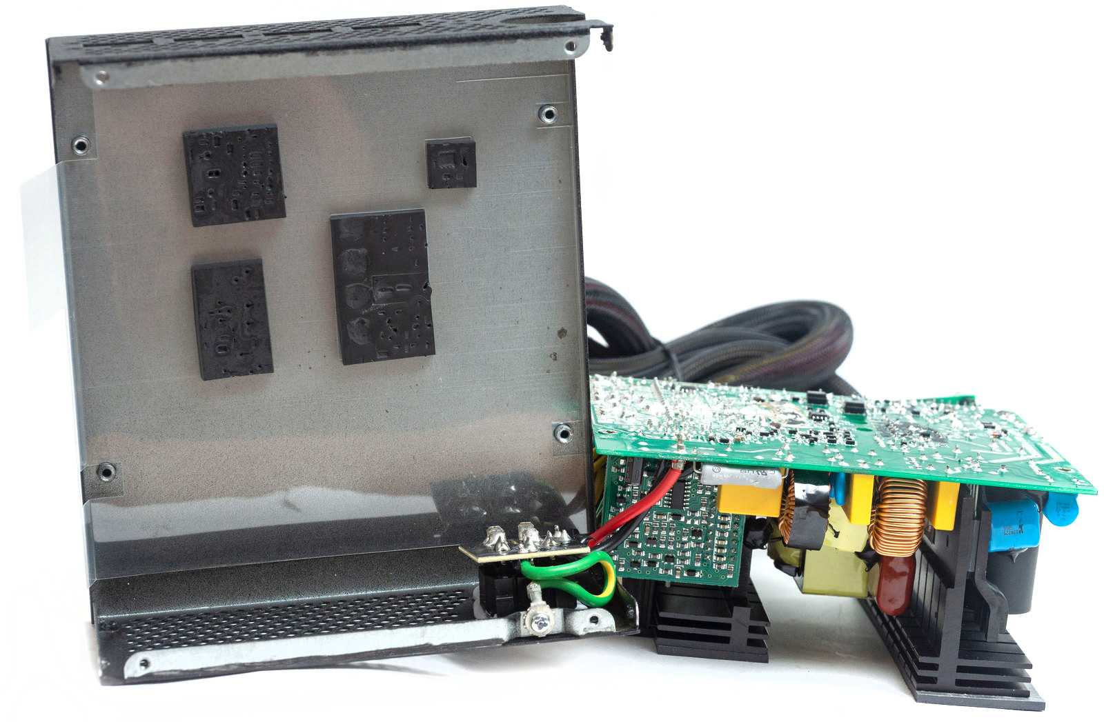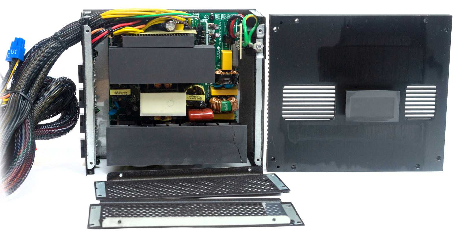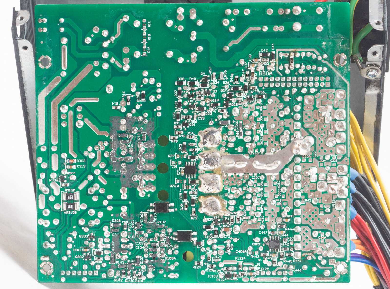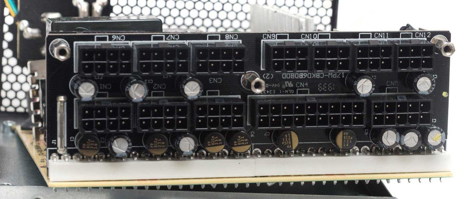 Но с другой стороны, как пользователю, нам бы хотелось видеть более современное исполнение. Полностью модульные блоки питания, даже меньшей длины, уже далеко не редкость. Использование проводов для подключения платы с разъемами также уже редко встретишь. Отсутствие элементарного варистора в схеме защиты нам не понятно. Напряжения хоть и вписываются в стандарт, но отклонение в 4% по линии +5 В – большая цифра для современного блока питания с платиновым сертификатом.