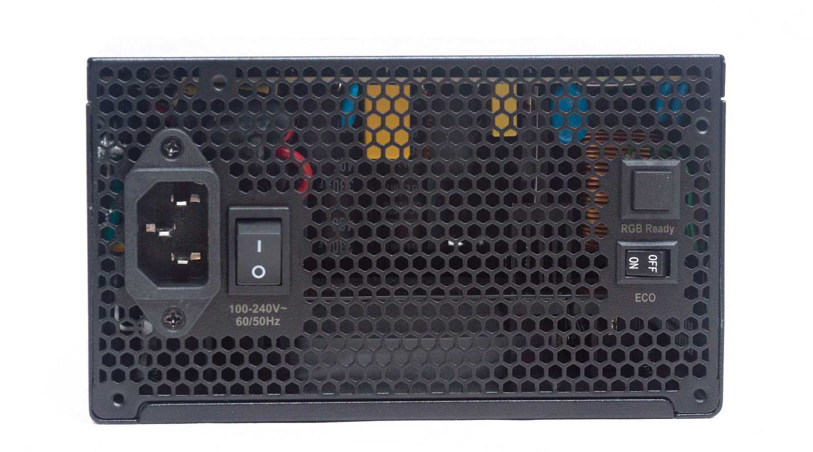 На лицевой стороне, кроме тумблера включения, находится тумблер переключения в ECO-режим, при котором вентиляторы будут работать в полупассивном режиме. Такие переключатели все чаще стали добавлять практически все бренды для своих моделей БП с полупассивным охлаждением. Это некий тренд в последнее время.