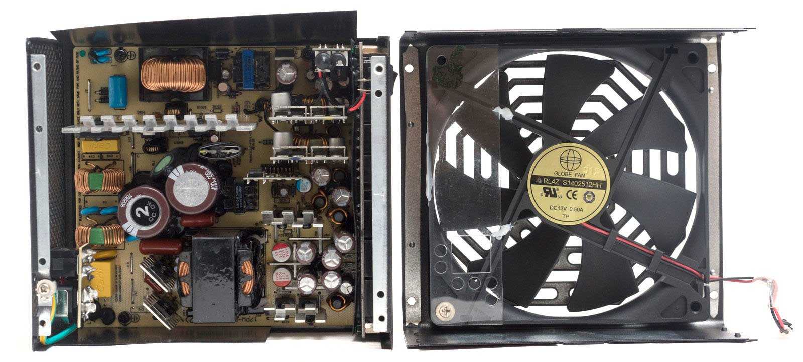В блоке питания установлен 140-мм вентилятор Globe Fan RL4Z S1402512HH на основе подшипника скольжения.