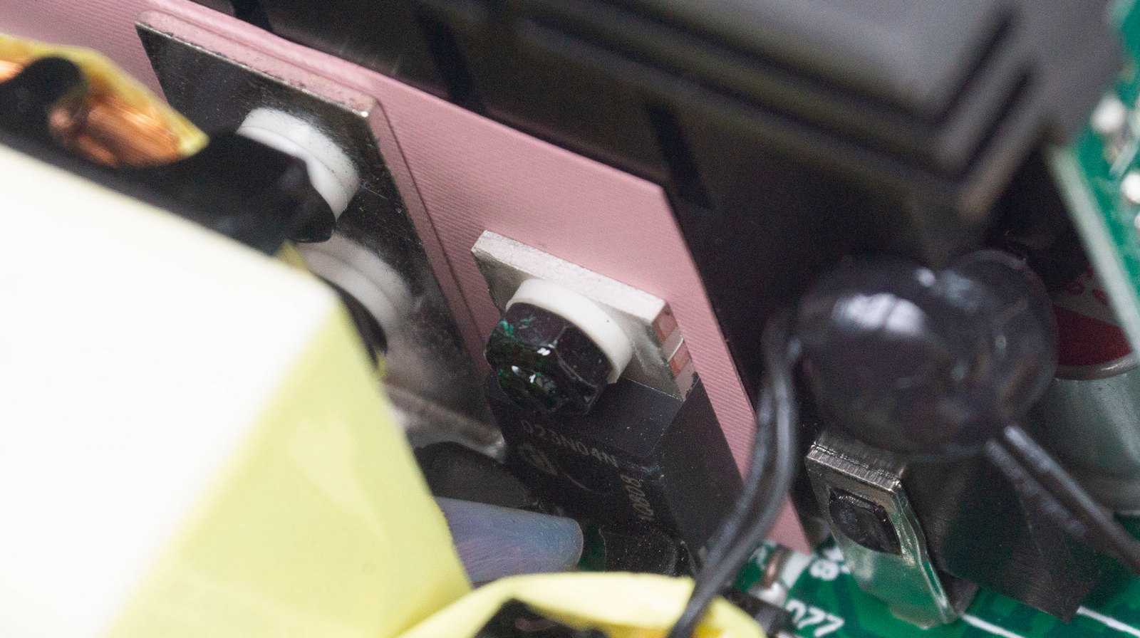 Пассивное охлаждение реализовано за счет трех крупных радиаторов Г-образной формы с широкими верхними площадками, которые контактируют с силовыми элементами. Данные радиаторы, в свою очередь, передают тепло на массивную крышку корпуса блока питания через термопрокладки, которая сама по себе также является радиатором.