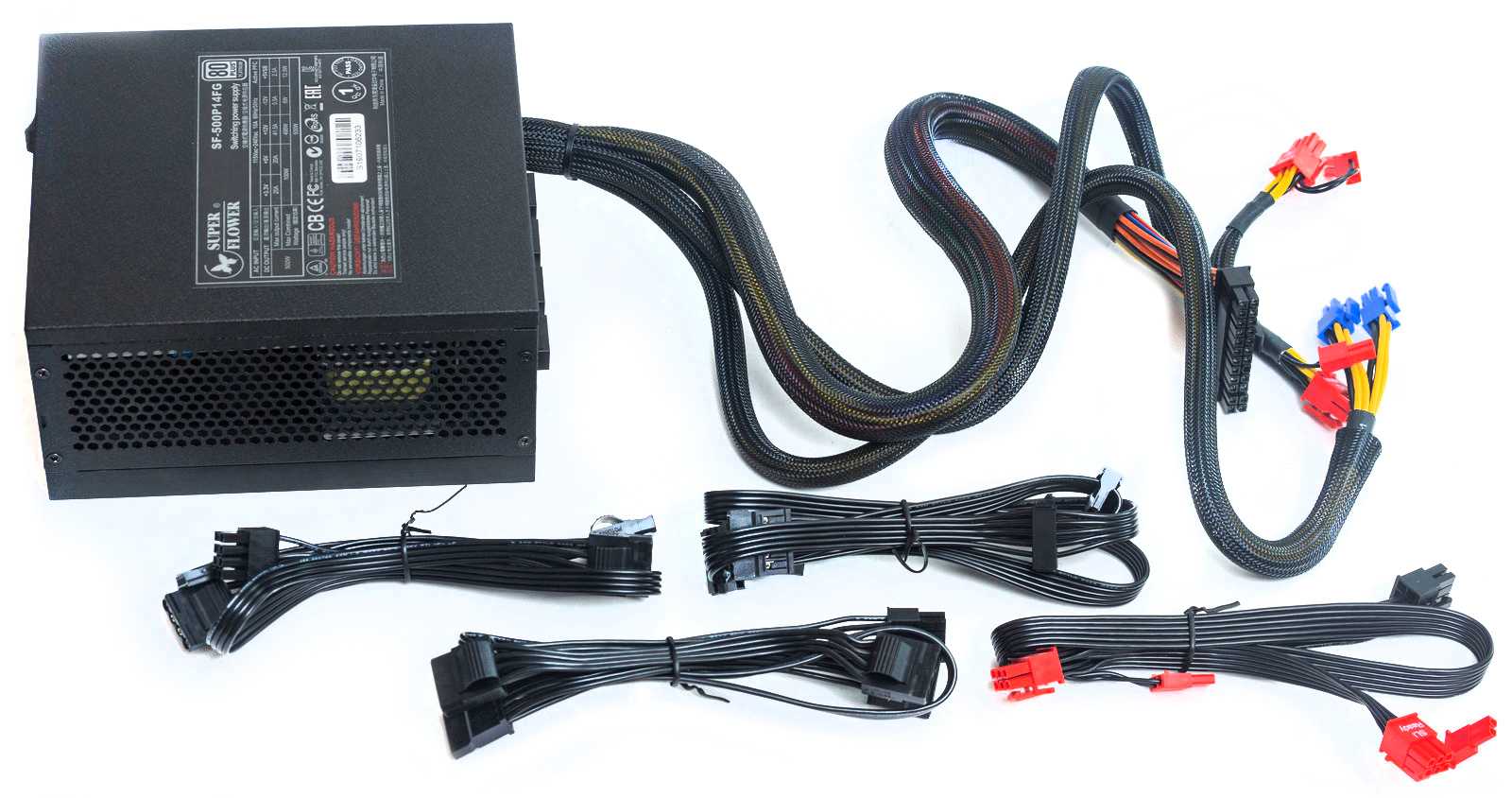 Кабели ATX, PCI Express и EPS круглые, они заключены в черную оплетку. Для питания периферии Super Flower добавила черные плоские шлейфы. По длине кабелей и качеству изготовления замечаний нет.