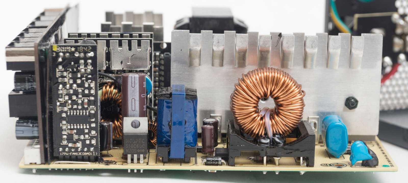 Дроссель APFC расположен на плате не перед, а за основным конденсатором, что нетипично. Между ними находится термистор защиты от пускового тока и реле для его отключения.