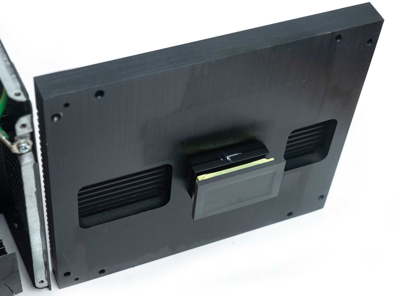 Нижняя панель выполнена в виде толстого и массивного алюминиевого радиатора с частыми ребрами в виде параллельных полос. В пластине имеются два небольших квадратных сквозных отверстия, перекрывающихся ребрами. Панель крепится на восемь винтов.