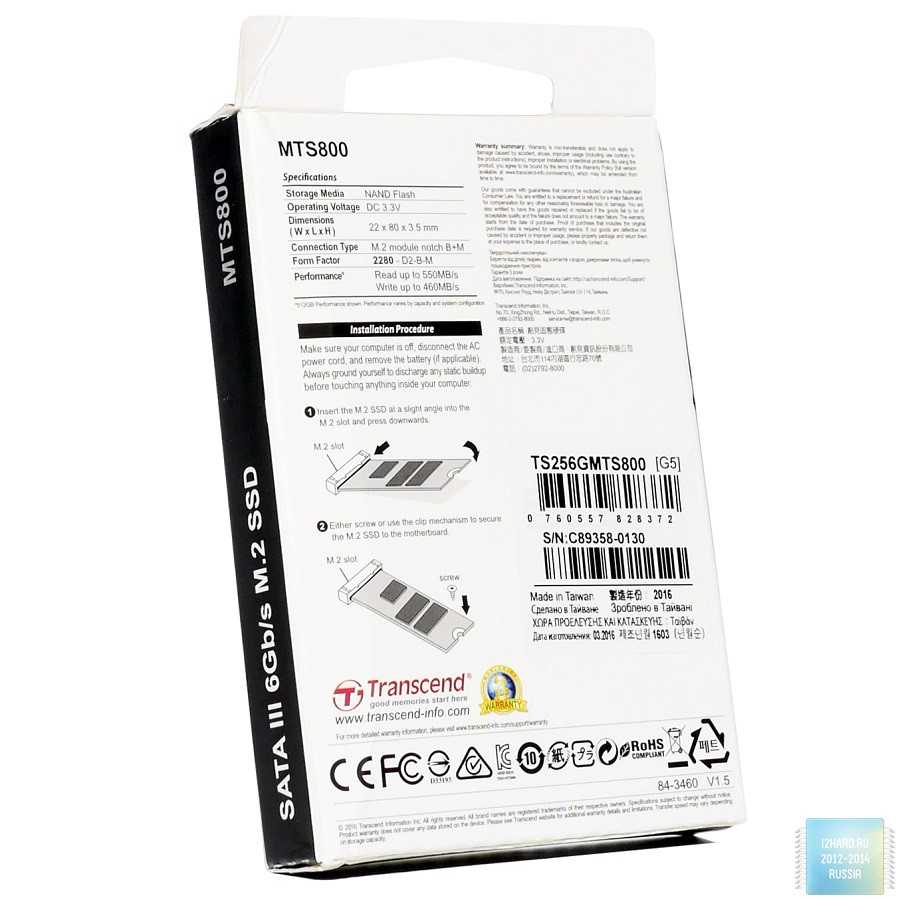 Устройства заключено в яркую упаковку с качественной полиграфией. Небольшая коробка легко уместится в карман джинсов. Спереди указан объем, размер и модель накопителя. Также упоминается про использование MLC NAND-Flash памяти. На обратной стороне расположена таблица со спецификацией, а на иллюстрациях приведён процесс установки.