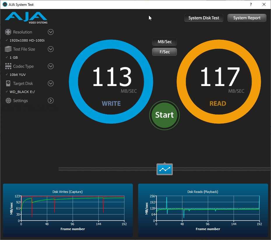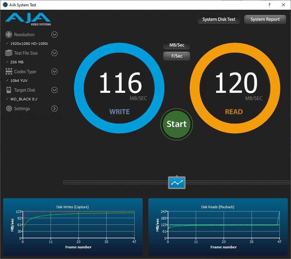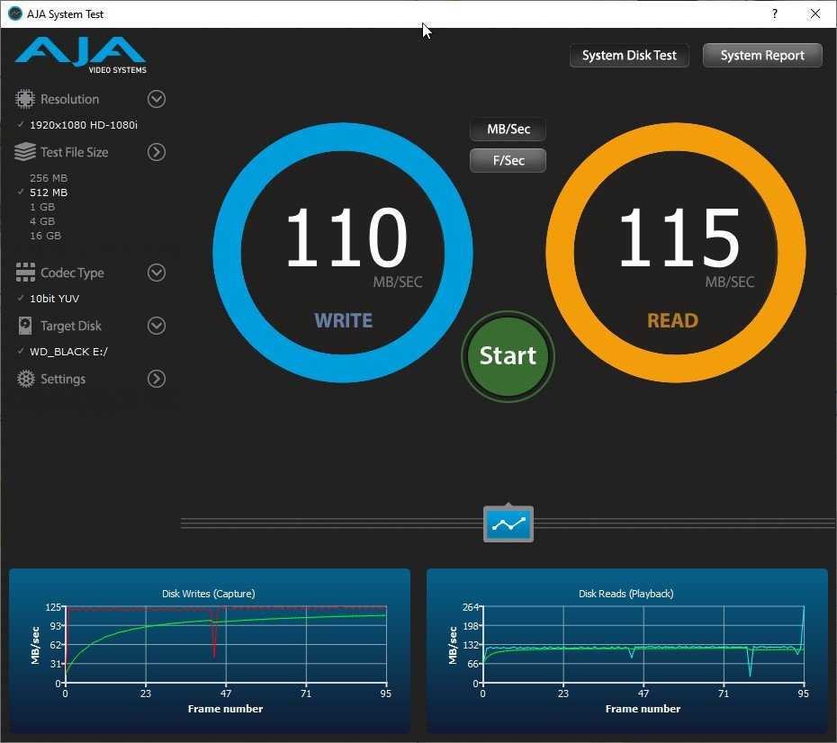 Утилита создает нагрузку, которая имитирует реальные условия работы жесткого диска при кодировании видео. При различном объеме тестовых данных скорость, как чтения, так и записи, стабильна и находится в диапазоне 110-120 МБ/с.