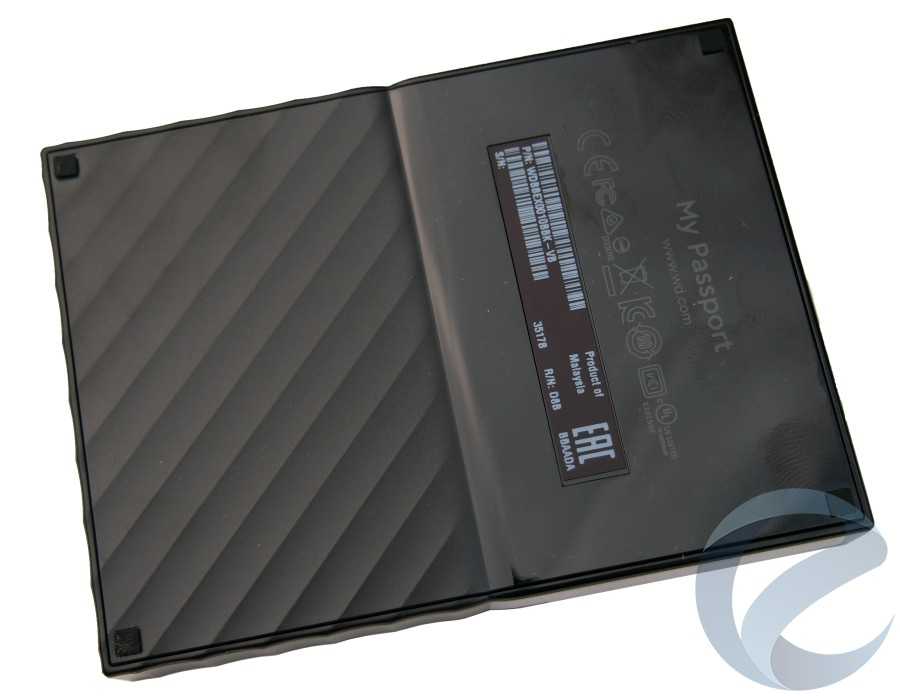 Тыльная сторона корпуса нового WD My Passport полностью повторяет разделение на матовую и глянцевую части. При этом на глянцевой половине мы можем наблюдать наименование серии накопителя, адрес официального сайта производителя, а также товарные знаки и наклейку с идентификационным и серийным номером диска.