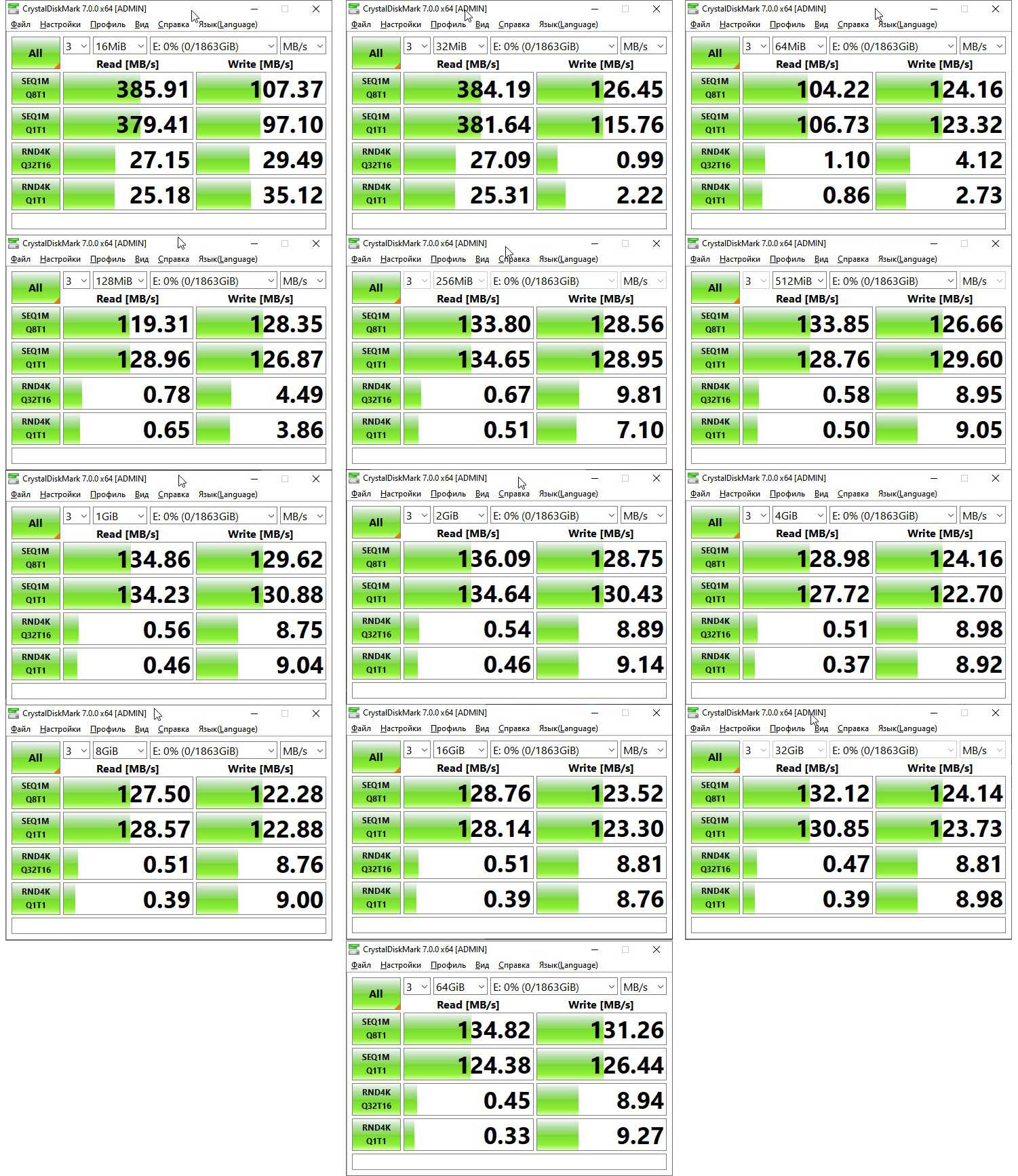 CrystalDiskMark – пожалуй, самый популярный инструмент для тестирования скорости накопителей. Используемая для тестирования версия программы – 7.0.0h. Проводились три тестовых прогона случайными данными на незаполненном накопителе.