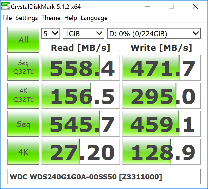 Надо сказать, что прошивка WD Green SSD оптимизирована таким образом, чтобы в простых тестах вроде CrystalDiskMark можно было выявить минимальное количество проблем в производительности. Поскольку размер тестового файла, создаваемого в CrystalDiskMark, невелик, операции чтения и записи фактически выполняются внутри SLC-кеша. И в этом случае увидеть ограничения в линейной скорости невозможно – они оказываются близки к пропускной способности интерфейса.