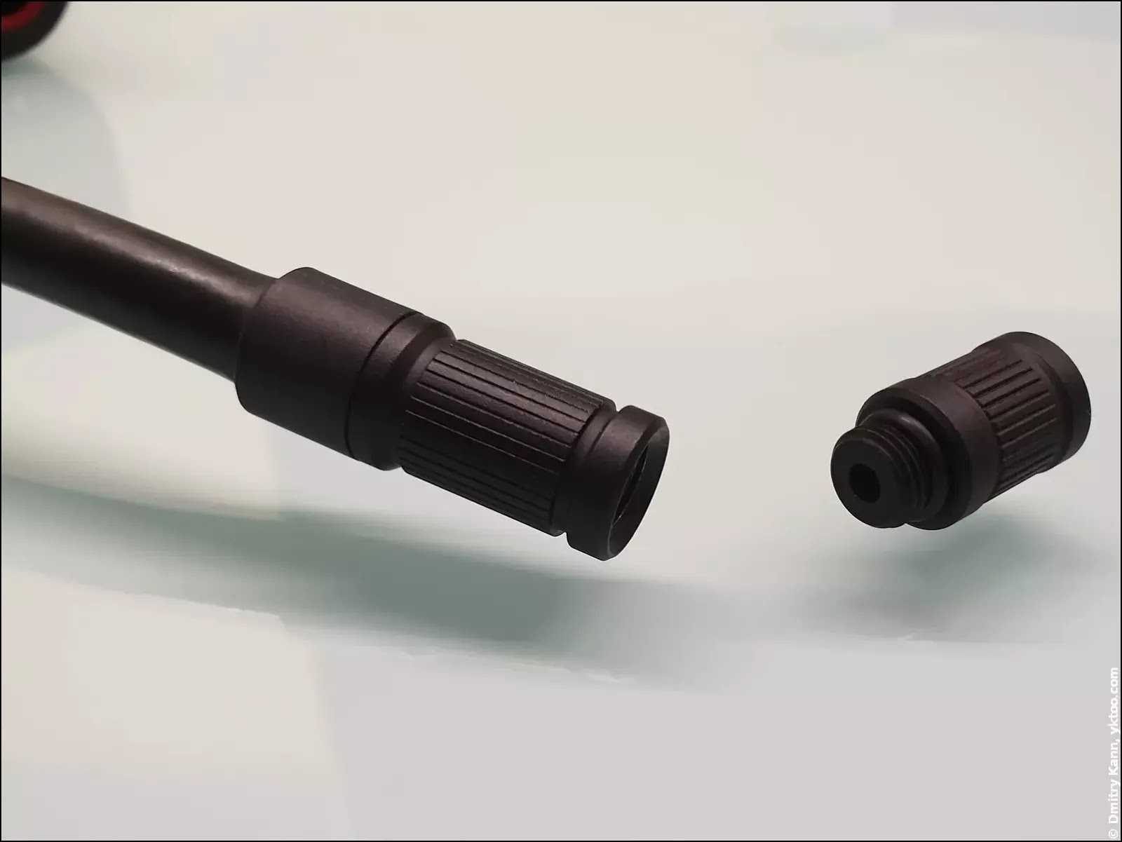 Штатно установленная на патрубке муфта подходит для автомобильного ниппеля; для велосипеда можно прикрутить к нему прилагаемый переходник. С этим же переходником его можно и хранить, если он постоянно используется — он нормально вставляется в отверстие.