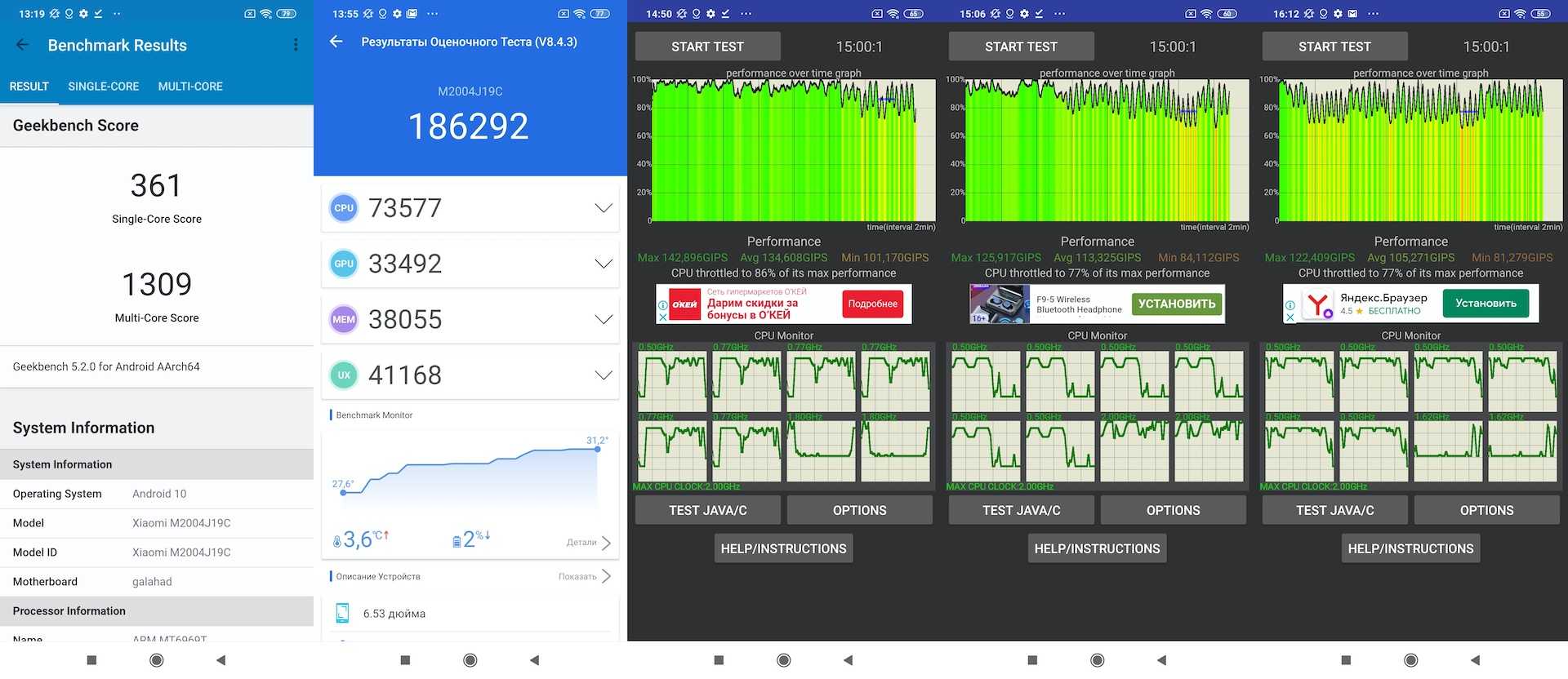 Благодаря большему объему оперативной памяти (Redmi Note 9 Pro поставляется исключительно с 6 Гбайт LPDDR4X) смартфон в бенчмарках смотрится предпочтительнее своего близнеца Note 9S. Но, как можно увидеть из графиков, серьезного прироста относительно прошлогоднего Redmi Note 8 Pro нет. Тем не менее запаса производительности хватит на то, чтобы и базовые приложения работали легко и непринужденно, и игры запускались любые, пусть и не всегда на максимуме.
