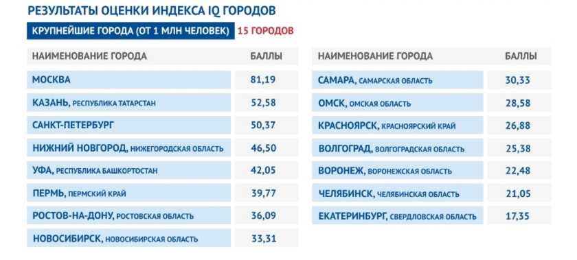 Среди крупнейших городов, с численностью от 1 млн человек, первые места в рейтинге заняли Москва, Казань и Санкт-Петербург.