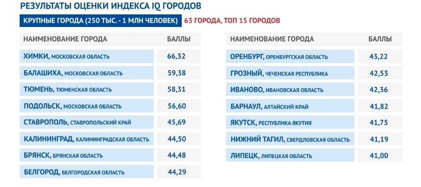 Из крупных городов, с населением от 250 тыс. до 1 млн человек, первые три места заняли Химки, Балашиха и Тюмень.
