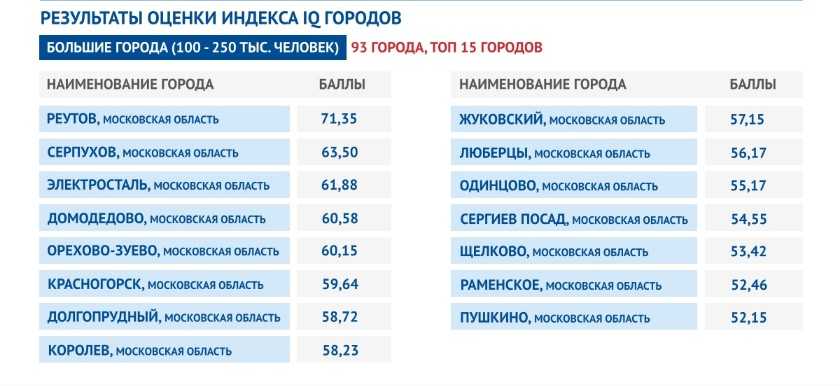 В категории больших городов, с населением от 100 до 250 тыс. человек, первые три места оказались за Реутовым, Серпуховым и Электросталью.